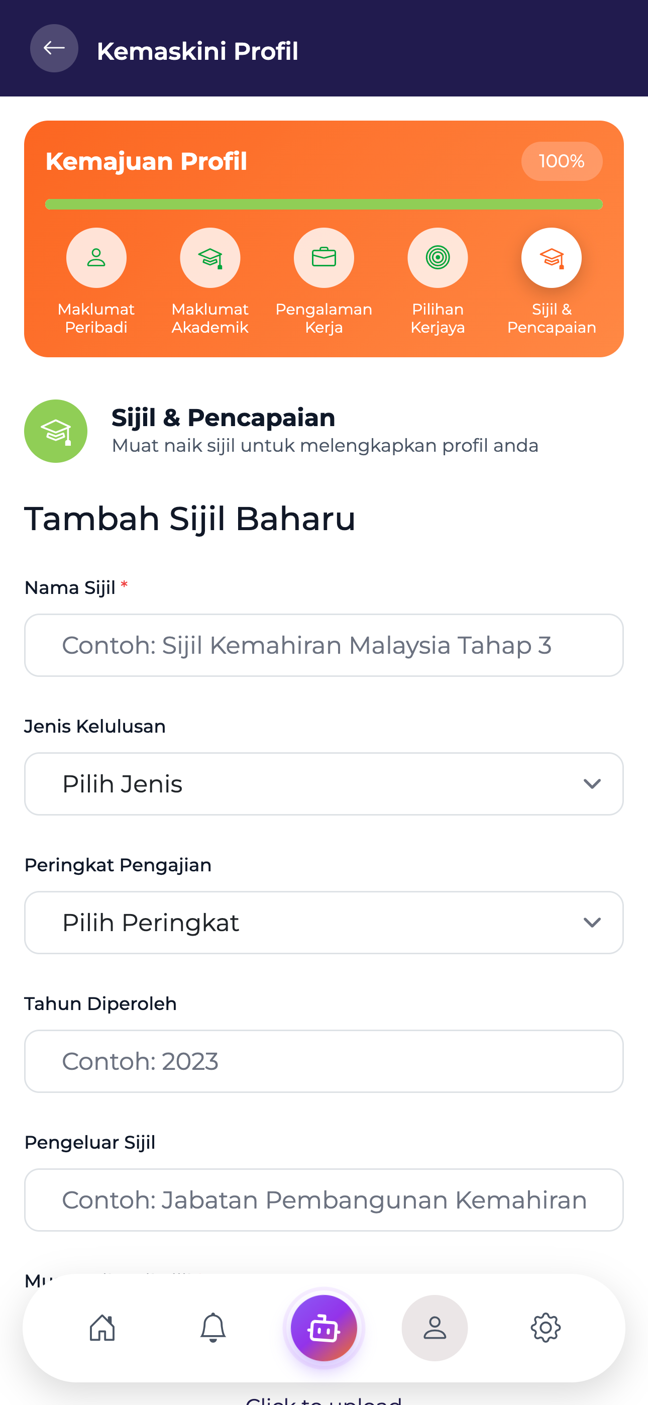 Peratusan Kemajuan Profil (contoh: 40%, 80%, 100%)