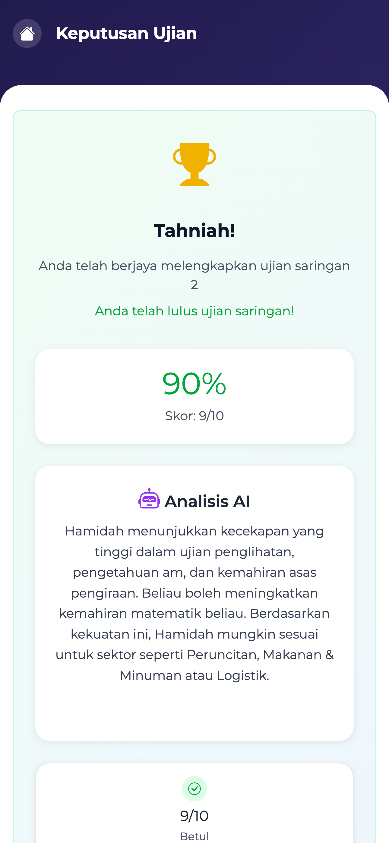 Berdasarkan prestasi Ujian Saringan, analisis AI menilai kekuatan dan potensi anda untuk mencadangkan bidang kerja yang paling sesuai.