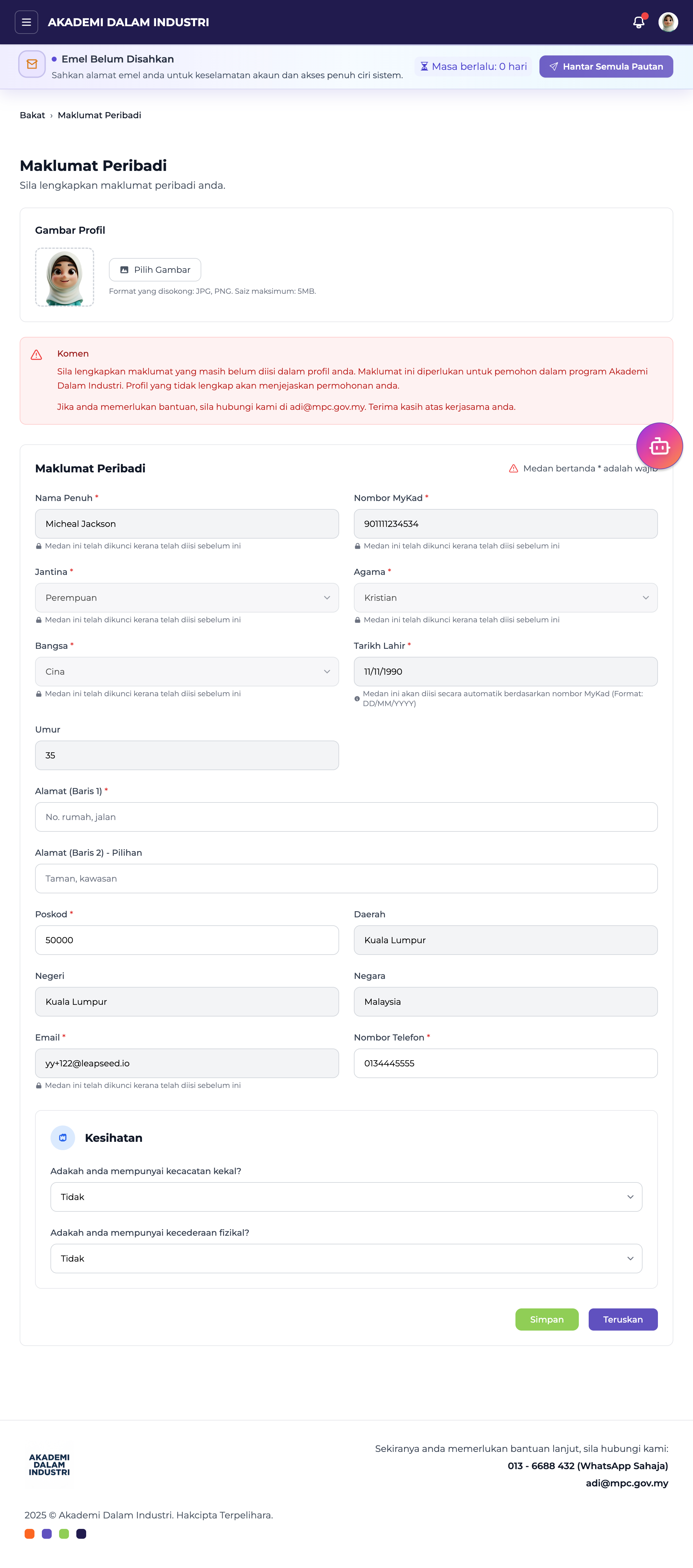 Selepas log masuk, anda perlu melengkapkan Maklumat Peribadi untuk mengakses ciri-ciri penuh dalam sistem ADI.