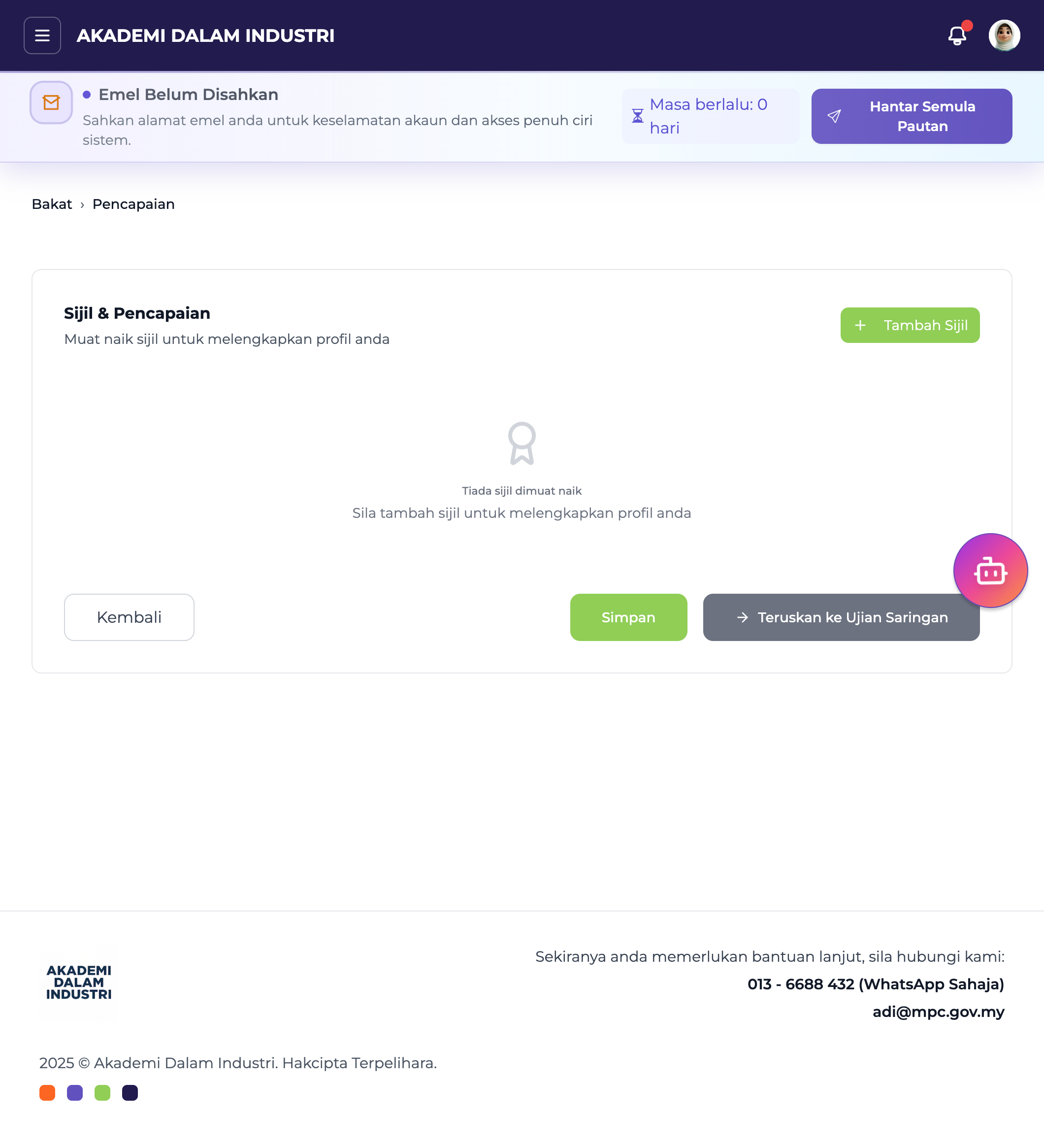 Bahagian Sijil & Pencapaian membolehkan anda memuat naik sijil latihan, kursus, atau pengiktirafan yang boleh meningkatkan peluang anda semasa pemadanan kerja dan semakan majikan.