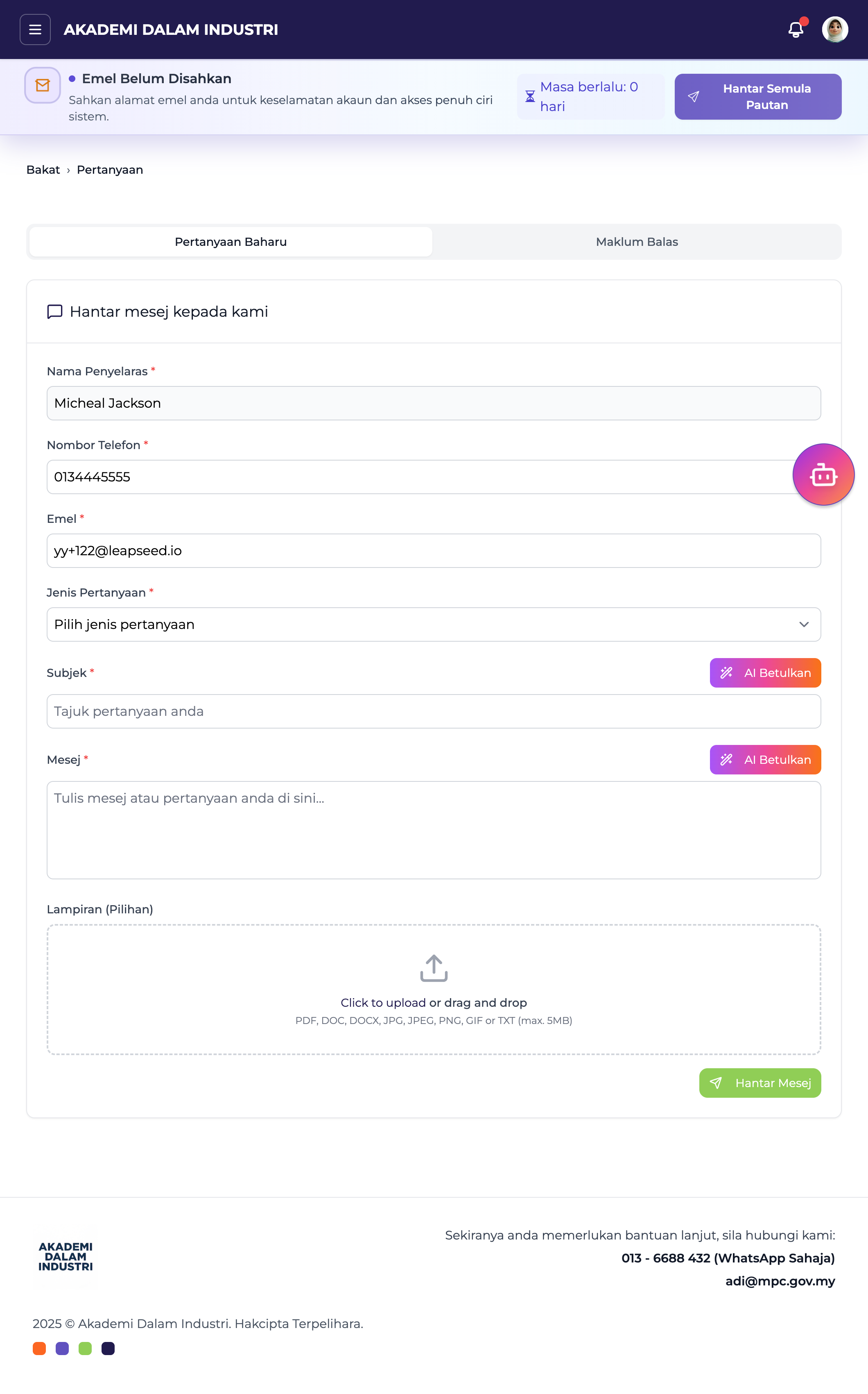 Bahagian Pertanyaan disediakan untuk membolehkan bakat menghantar soalan, permohonan bantuan atau maklumat tambahan terus kepada pihak ADI.