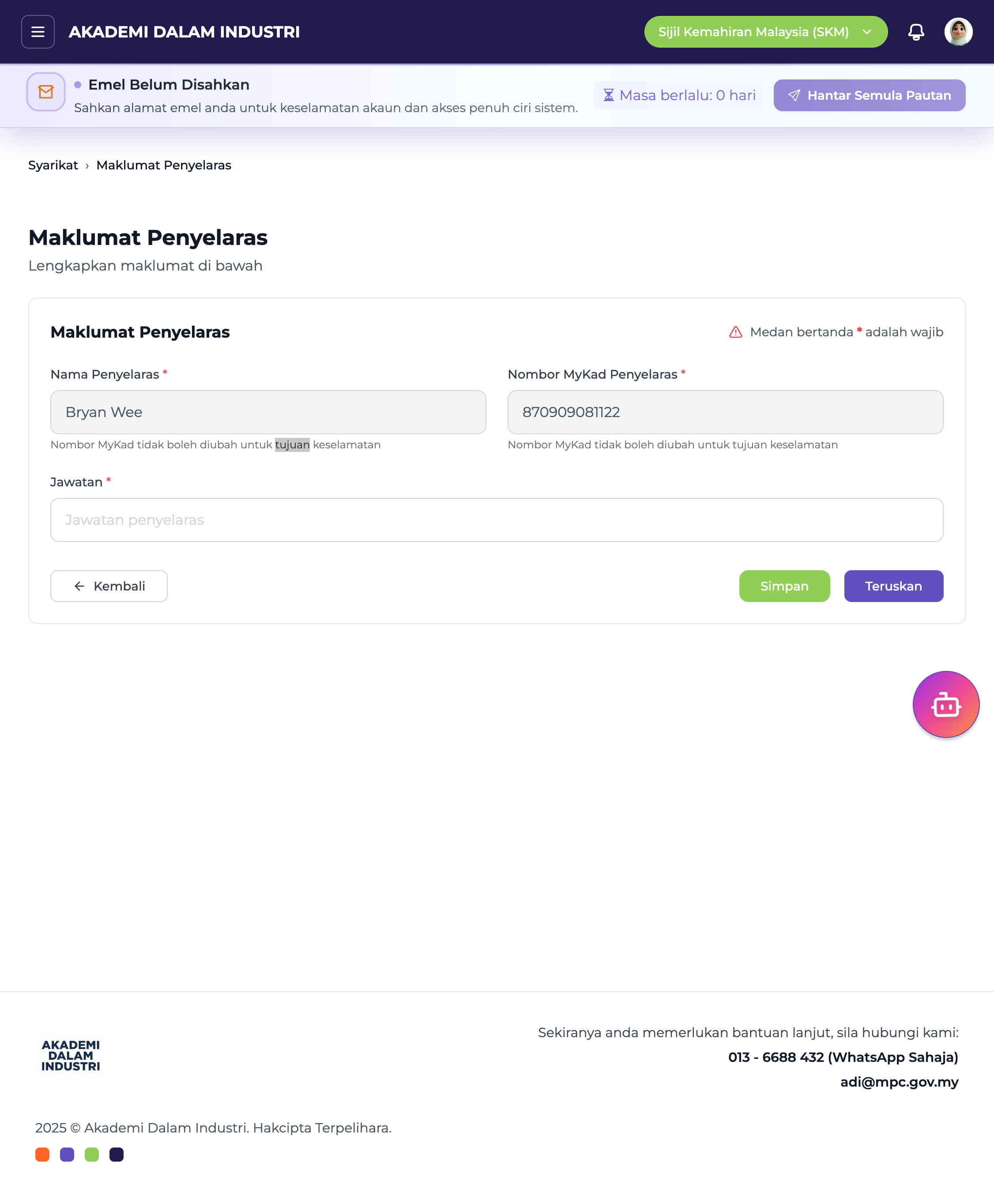 Nama: Masukkan nama penuh penyelaras (PIC syarikat).