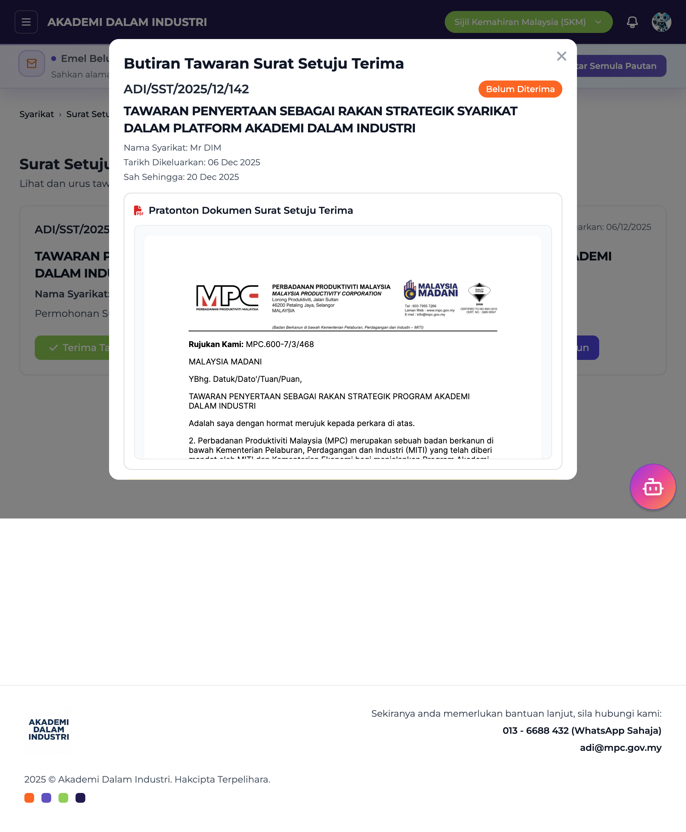 i. Tekan butang Terima Tawaran untuk mengesahkan penyertaan syarikat dalam program ADI.