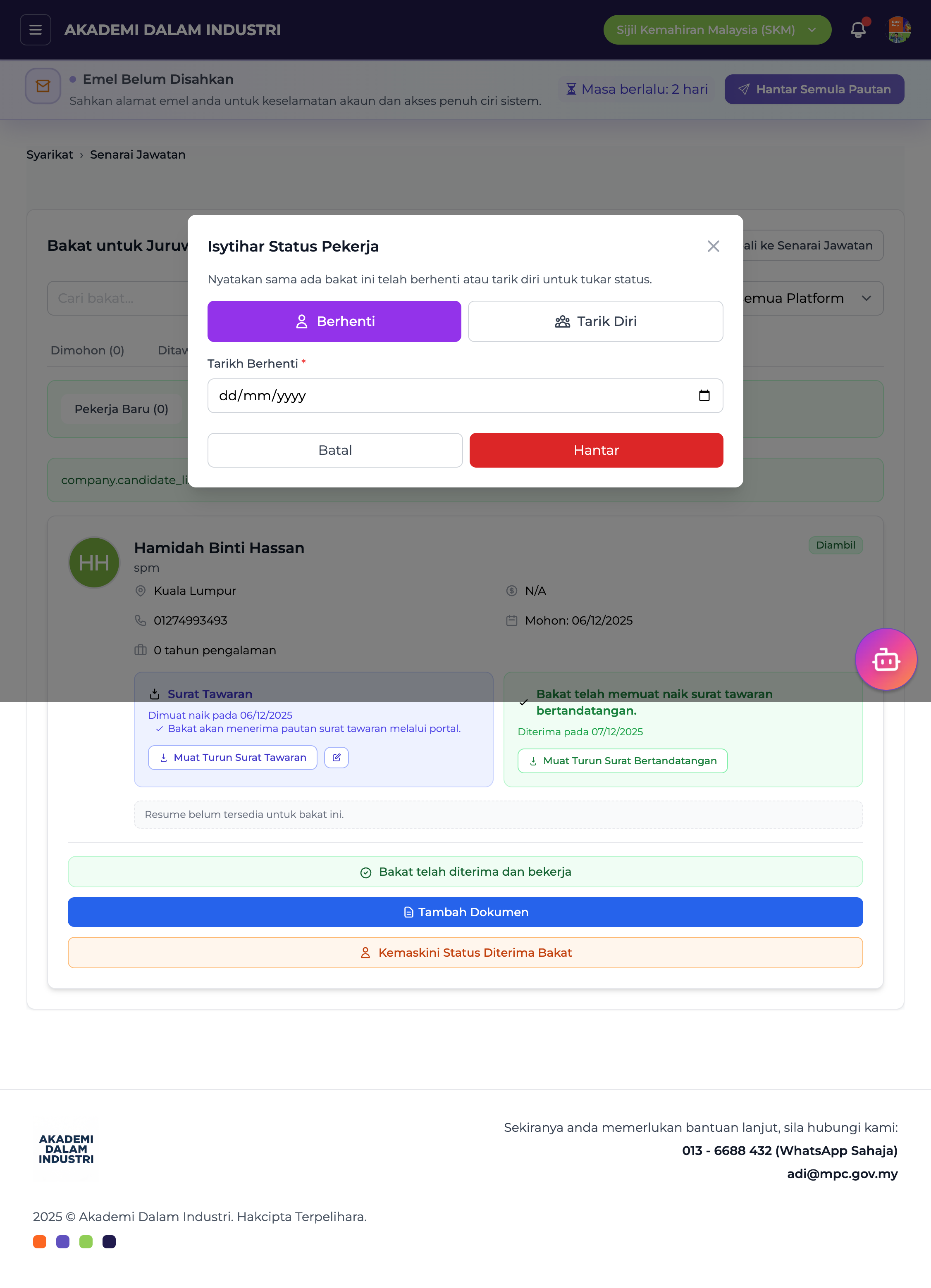 Kemaskini status perkhidmatan bakat (jika berhenti / tarik diri).