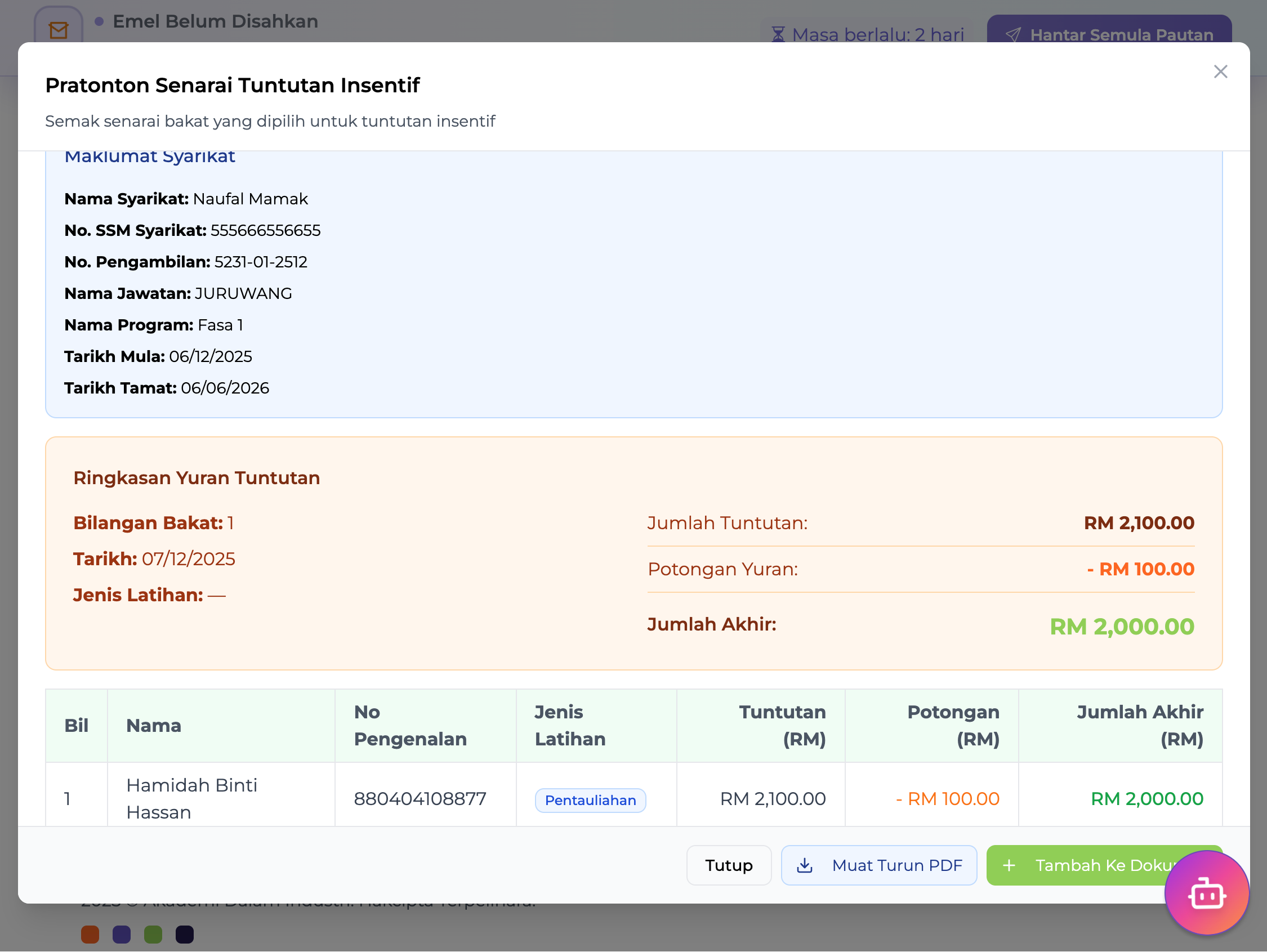 Dalam senarai bakat, anda akan nampak maklumat tuntutan.