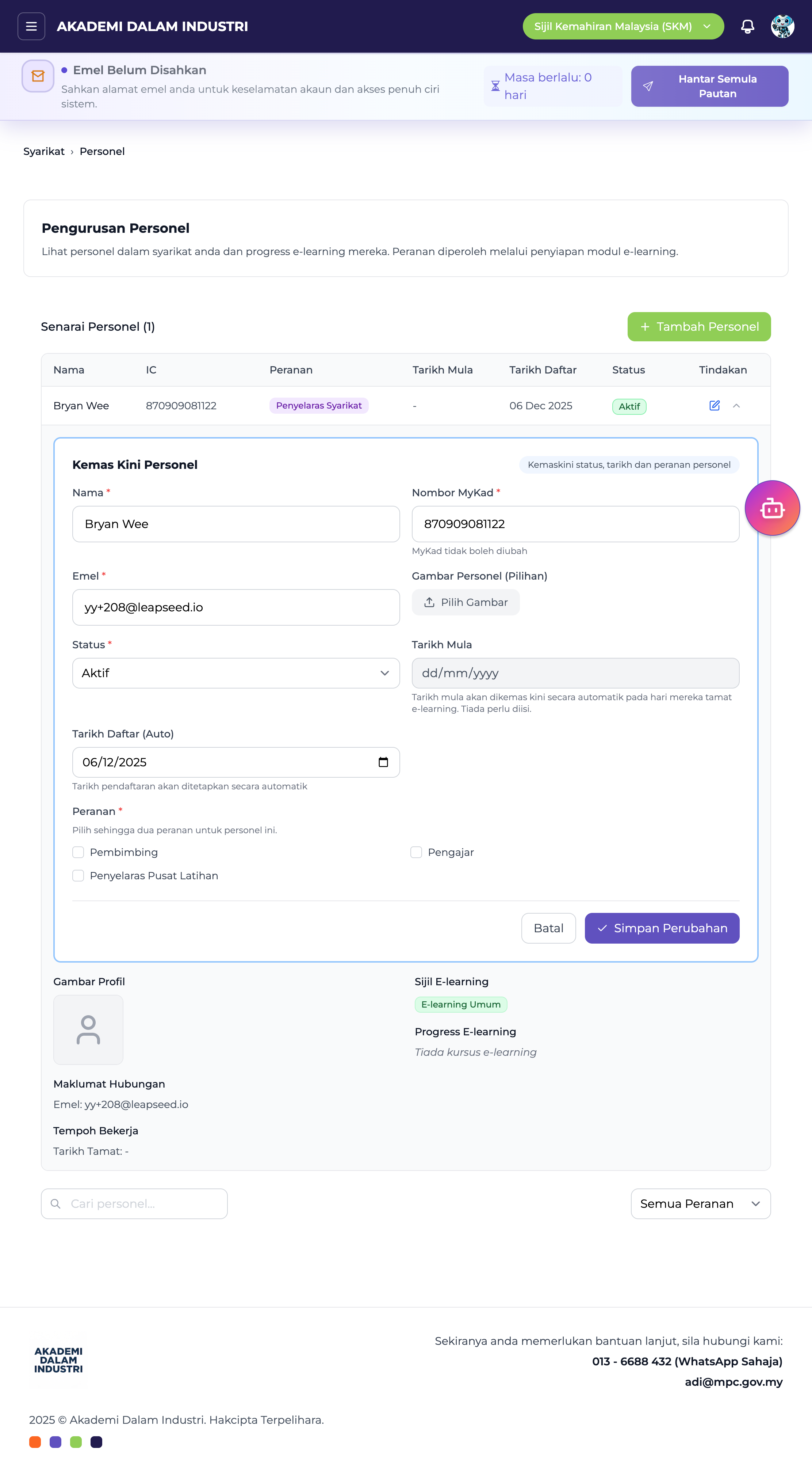 Bahagian ini digunakan untuk menambah, mengemaskini, dan mengurus personel syarikat. Setiap personel akan menerima akses ke modul e-learning apabila ditambah ke sistem.