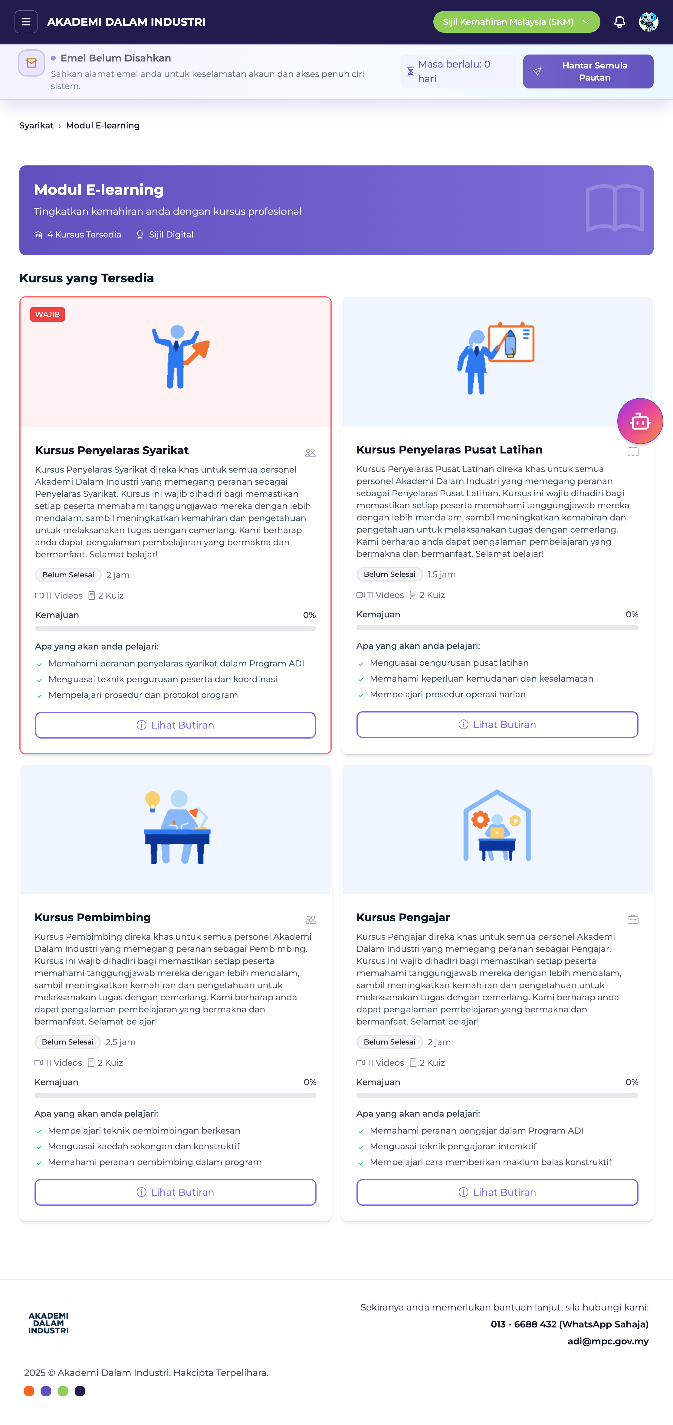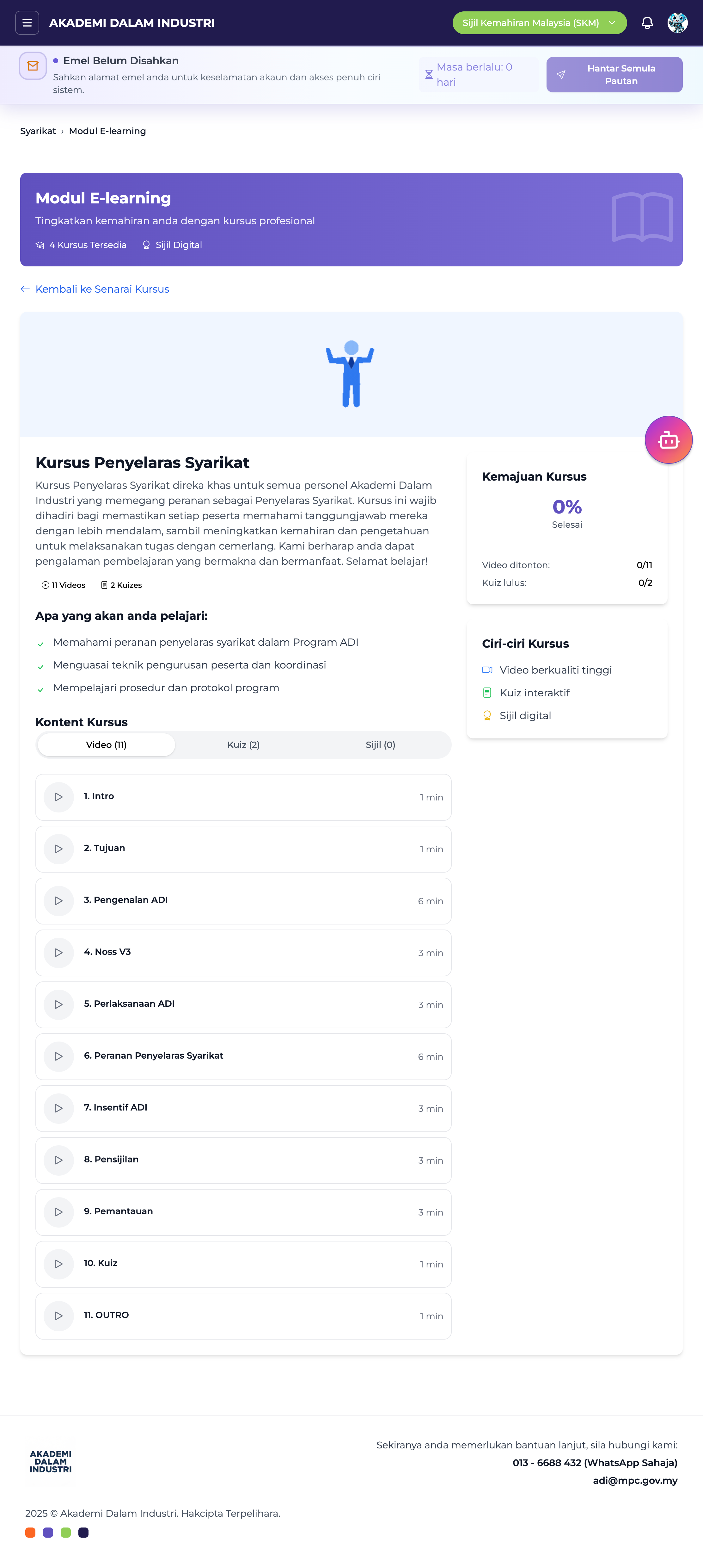 Modul E-learning disediakan untuk semua personel syarikat yang memegang peranan dalam Program Akademi Dalam Industri (ADI). Setiap personel perlu menamatkan kursus bagi mendapatkan Sijil E-learning, yang diperlukan sebelum terlibat dalam proses tuntutan, pemantauan, dan operasi program.