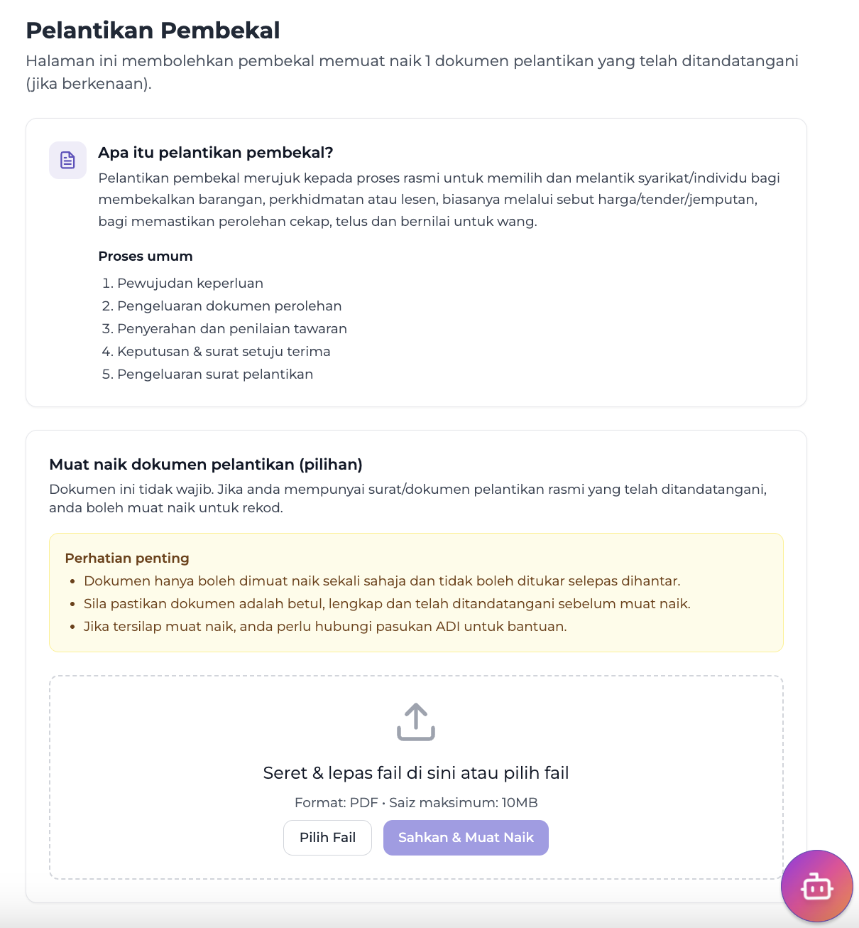 Institusi pembekal perlu memuat naik dokumen pelantikan dan sokongan yang diperlukan untuk semakan serta pengesahan oleh pihak Admin MPC.
