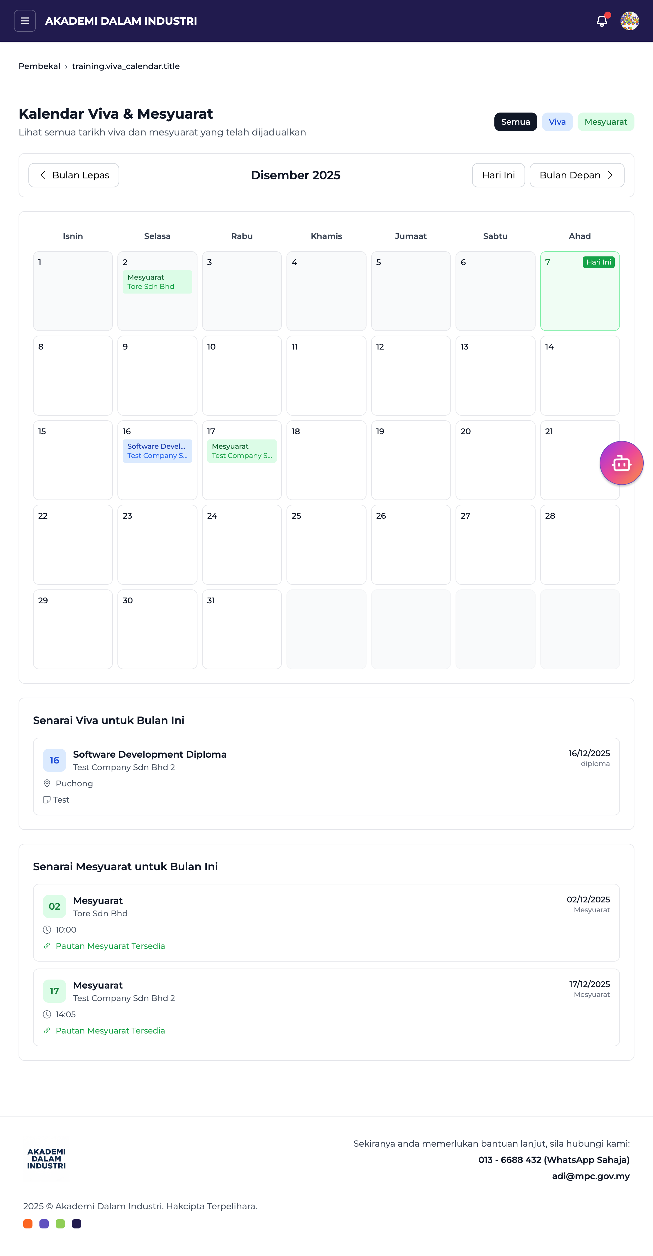 Modul Kalendar Viva & Mesyuarat membolehkan pihak pembekal melihat semua tarikh penting yang telah dijadualkan untuk viva calon dan mesyuarat bersama syarikat.